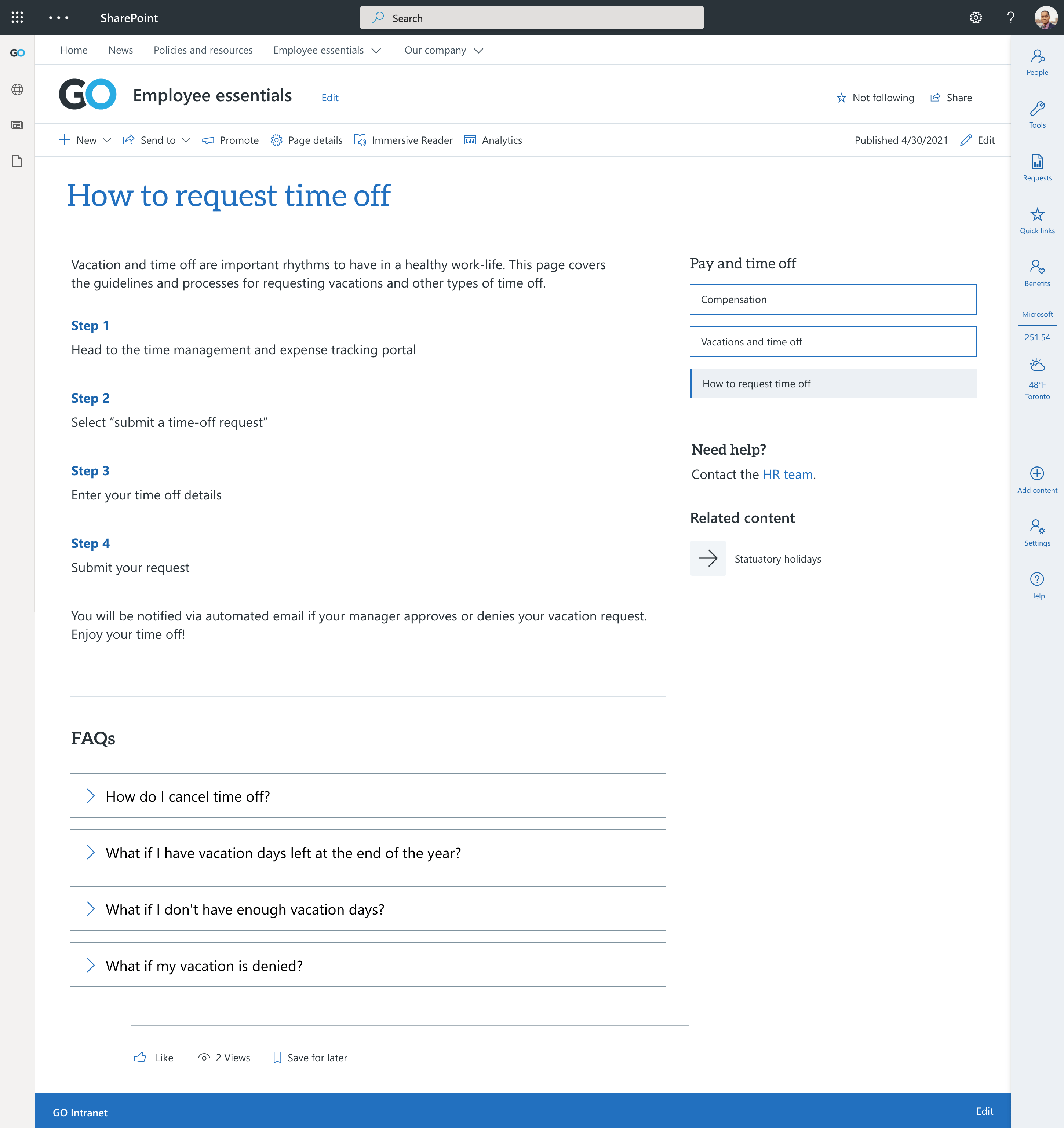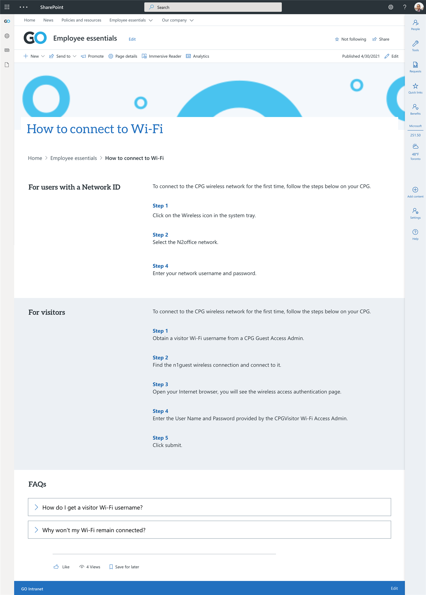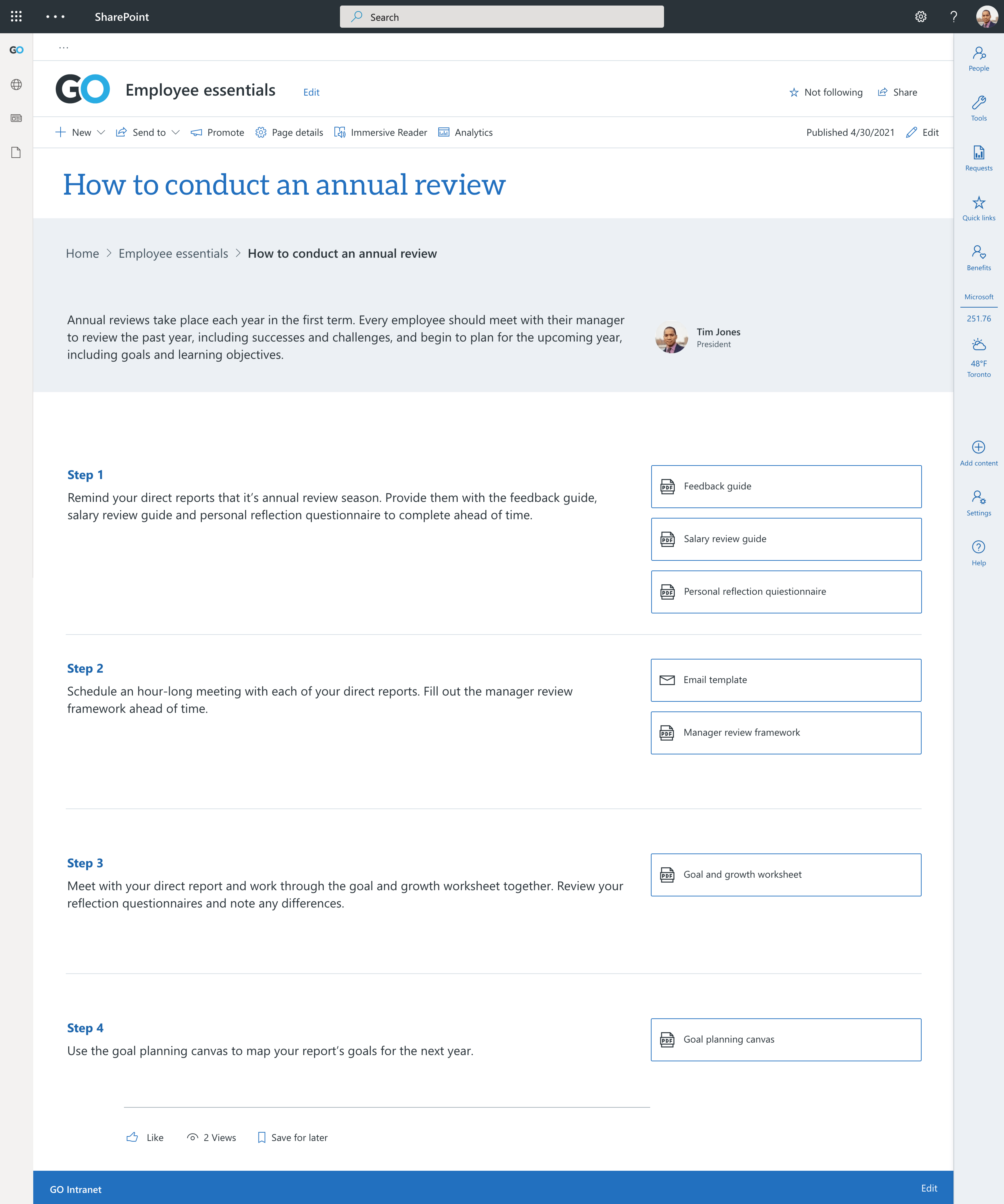 Provide users with a shortcut to items related to the how-to content. Using fluent icons in a quick link web part is a great way to help users anticipate what will happen when they click on that link.