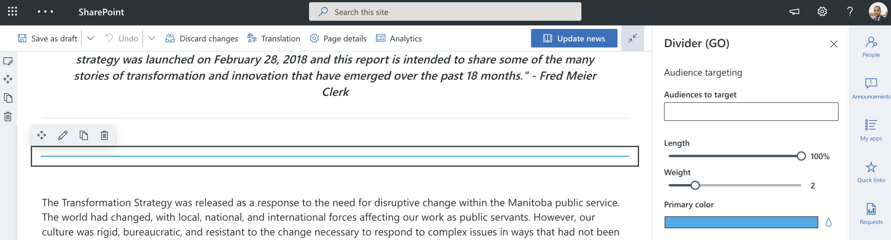 Like spacers, dividers are a great way to break up your content. With the out-of-the-box divider web part, you can only control the length of the line and its weight. For GO Intranet, we wanted more functionality, so we created a divider web part that allows you to customize both the size and colour of the divider. We love a pop of colour! And it allows you to enhance the presentation of your brand.