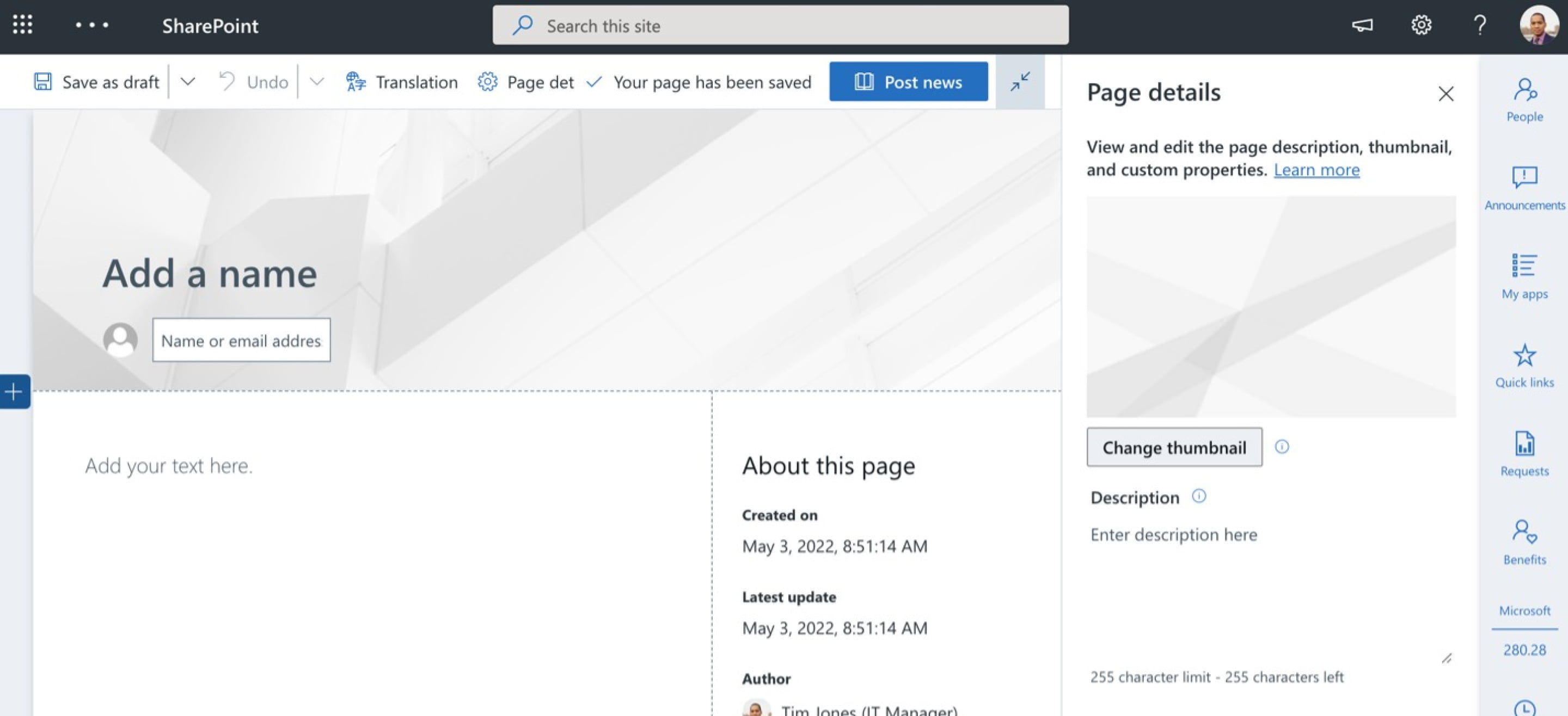 Last but certainly not least, don’t forget to set a page thumbnail for your news article! This is especially important with this content type as it will roll up in your news layout (this could be on your home page – so the stakes are high!). Use an image that gives context to your article and what an employee could expect from reading it.