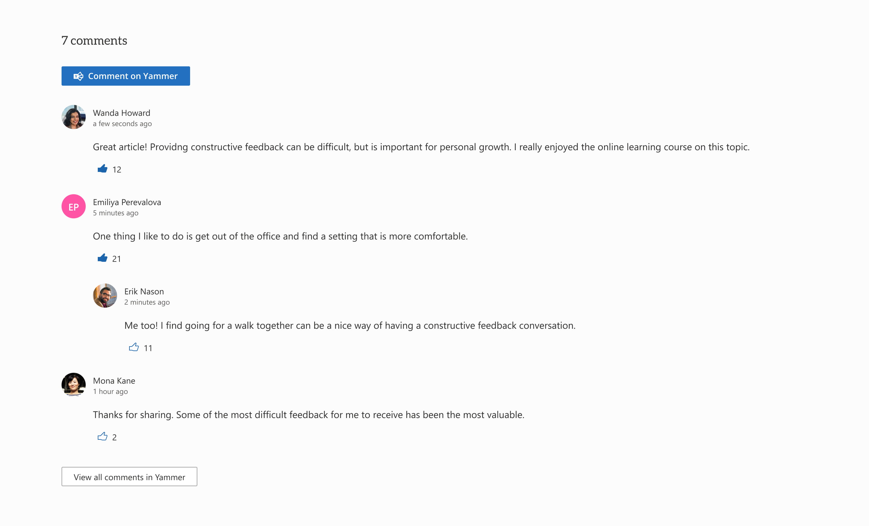 - Enable Yammer commenting on news articles to keep conversations about the article in one place rather than split across SharePoint and Yammer.