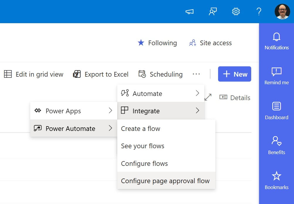 2. Select from the navigation options the Integrate dropdown and choose Power Automate and then “Configure page approval workflow.”
