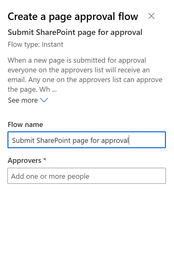5. Give the flow a name (e.g., “Page approvals”) and set up people to be approvers.