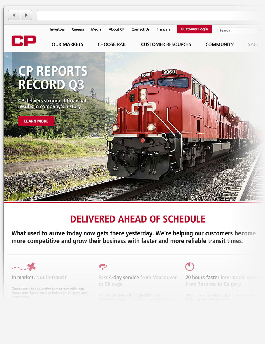 CPR.ca is built on SharePoint 2013 and is an example of a visually rich, fully responsive website and integrated marketing tool. CPR.ca is an enterprise-level customer portal designed with CP’s business in mind.