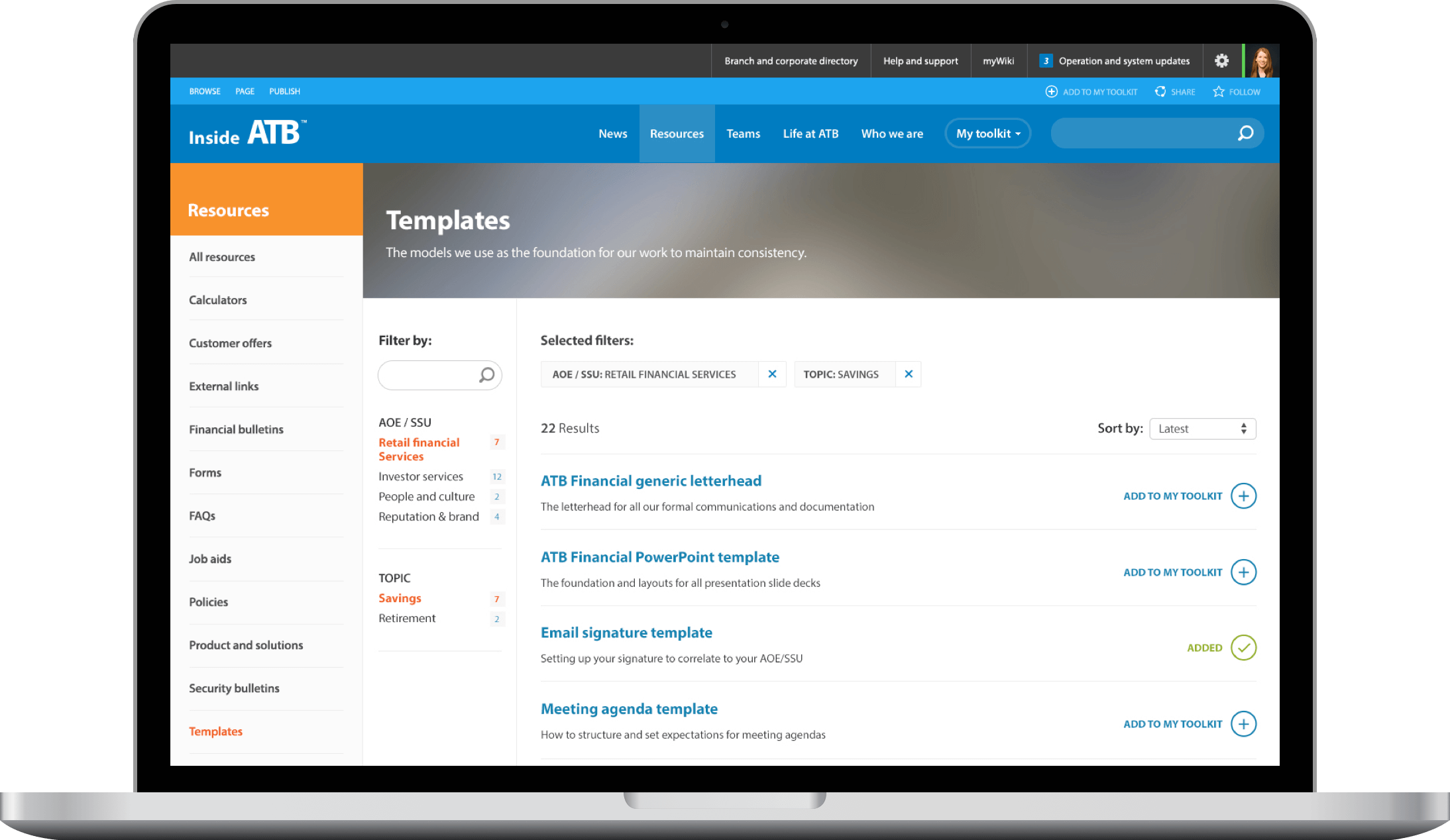 ATB is focused on providing an exceptional branch experience tailored to an individual’s needs. Employees have a central place to find everything they need to serve customers, including policies and procedures, forms, and more. Metadata tags organize content by business unit, topic, or type—ensuring employees can find what they need quickly.